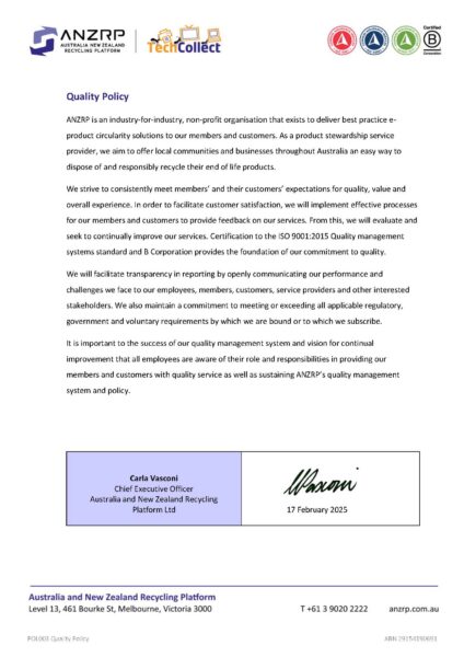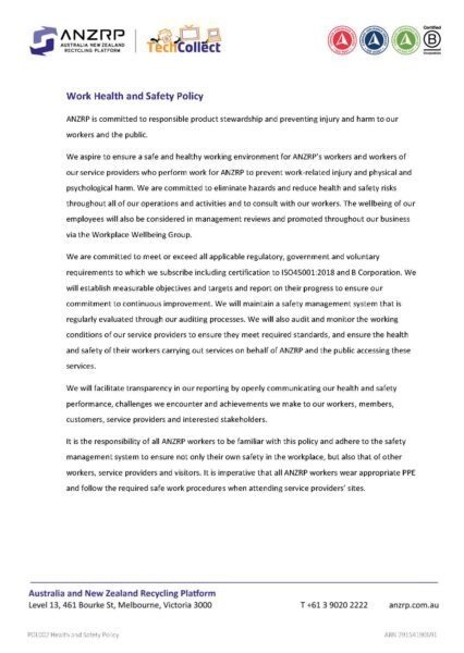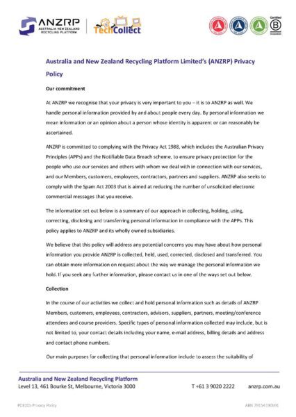 ANZRP is dedicated to creating a community that collects, processes and safely recycles electronic waste for responsible environmental outcomes. We operate under the following policies. Environmental Policy Health and Safety Policy Quality Policy Privacy Policy Risk Management Policy ANZRP Certificate 2023 Human Rights Policy Whistleblower Procedure